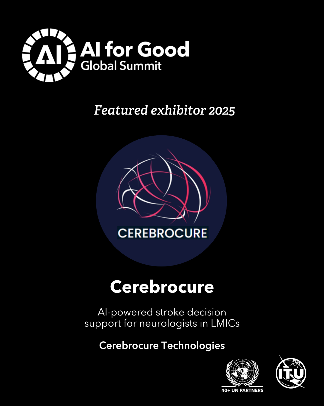 Cerebrocure Technologies was honored to be a Featured Exhibitor at the AI for Good Global Summit 2025, organized by the United Nations and the International Telecommunication Union (ITU) in Geneva, highlighting our mission to advance equitable healthcare through technology.