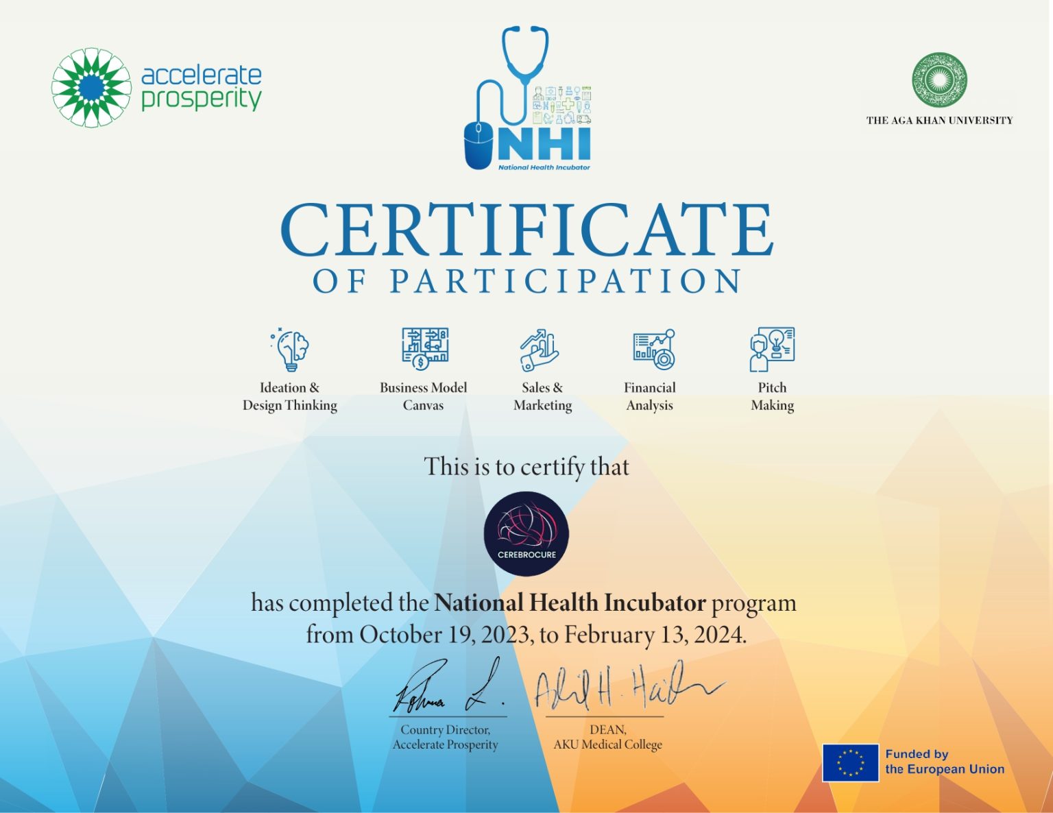 Dr. Saira Osama was awarded a Certificate of Participation by the National Health Incubator, a joint initiative of Aga Khan University and Accelerate Prosperity, in recognition of her successful completion of the incubator program.