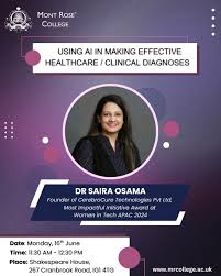 Dr. Saira Osama, Founder & CEO of Cerebrocure Technologies, was invited as a guest lecturer by the Department of Social and Health Care at Mont Rose College, London. She delivered a lecture titled “Using AI in Making Effective Healthcare / Clinical Diagnoses”, where she shared insights on the transformative role of artificial intelligence in healthcare.